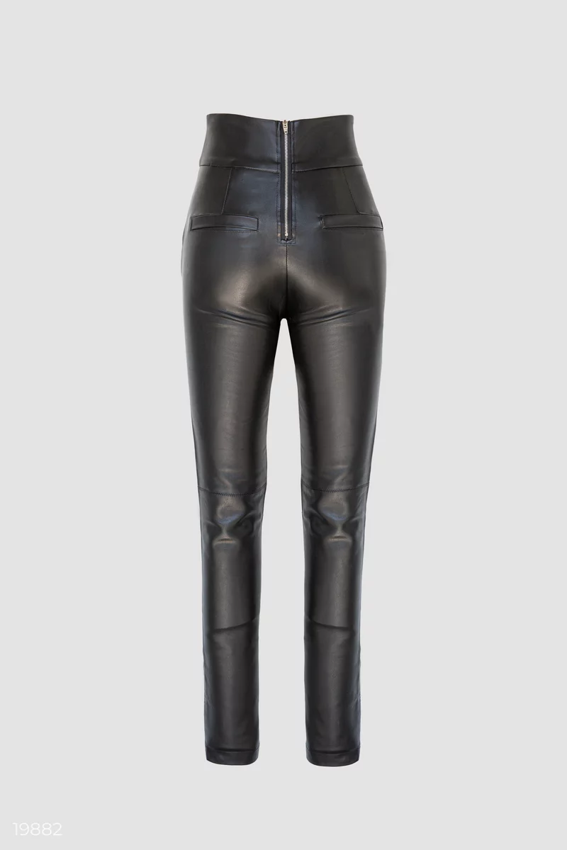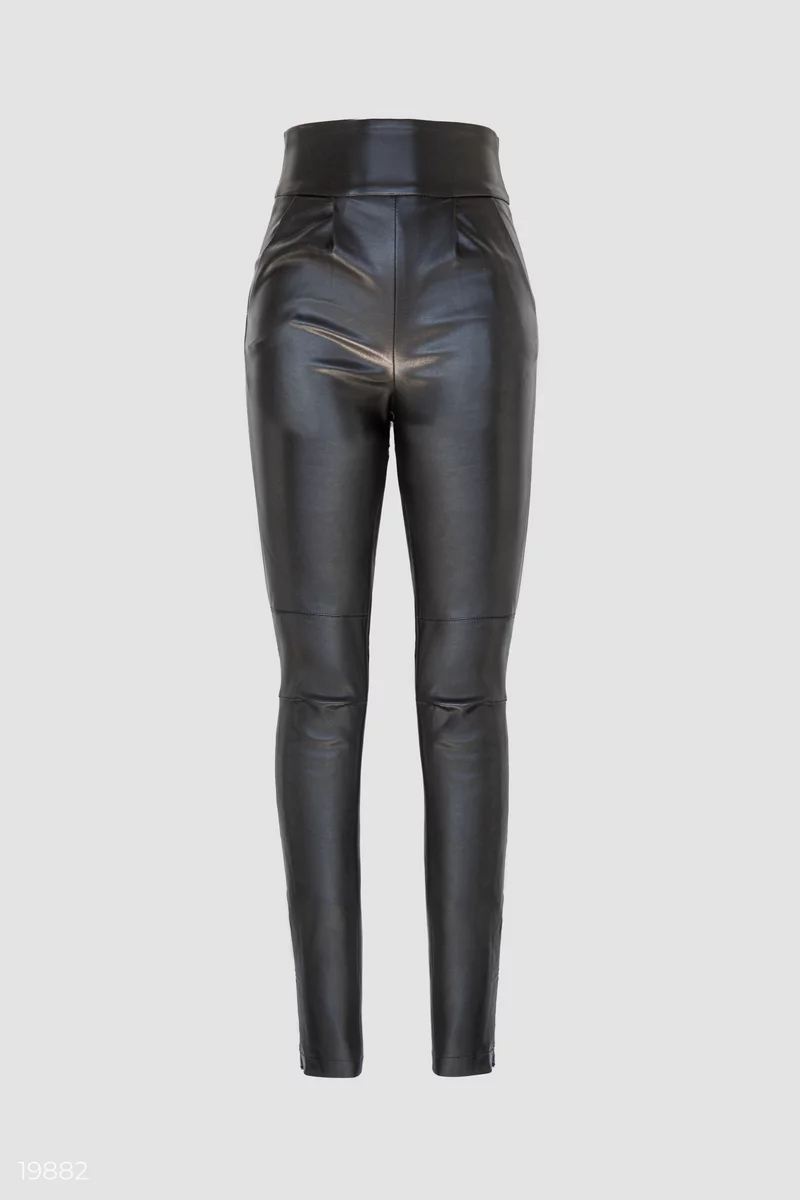 Облягаючі легінси від дизайнерів Gepur, виконані з матової еко-шкіри на м'якій замшевій основі: висока посадка, втачний пояс з невеликими защипами, дві прорізні кишені з боків і кишені-обманки ззаду.