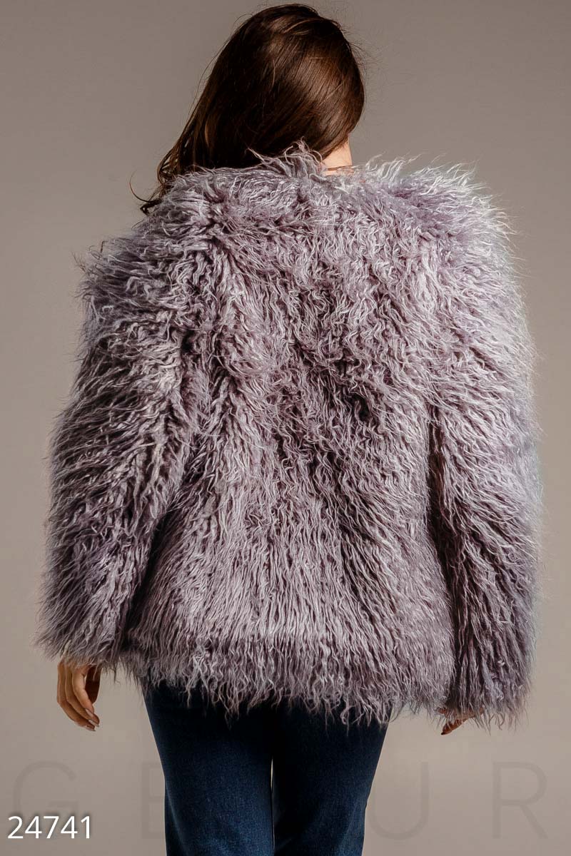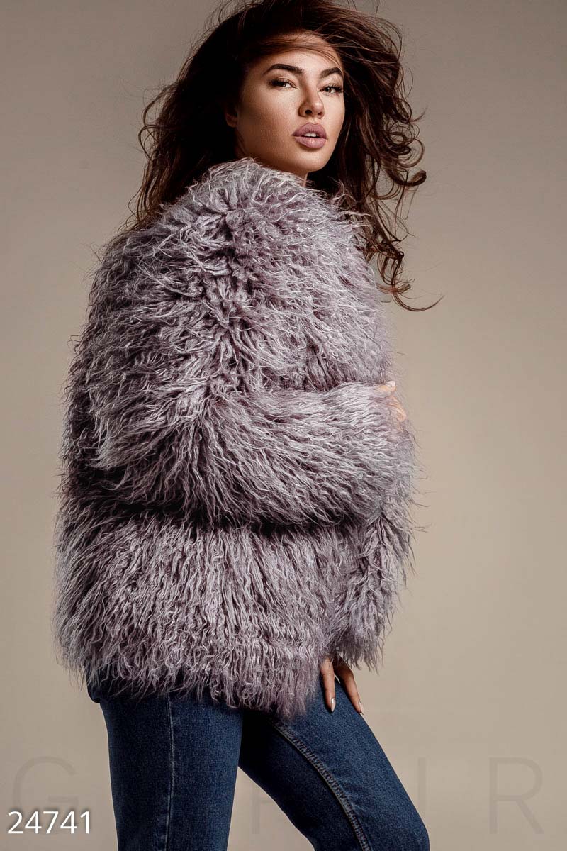 Короткая женская шуба из модного ворсистого эко-меха, без воротника, с двумя небольшими боковыми карманами.